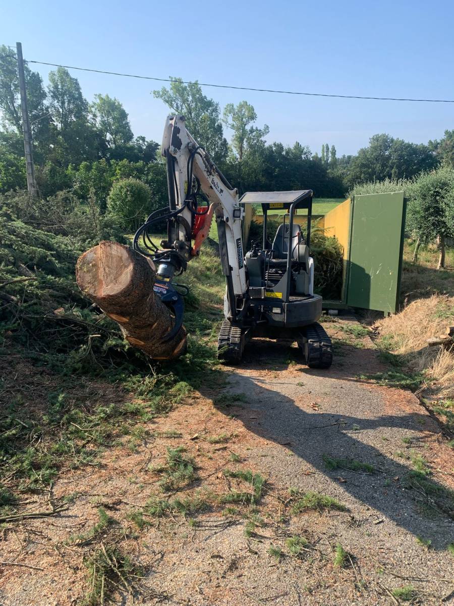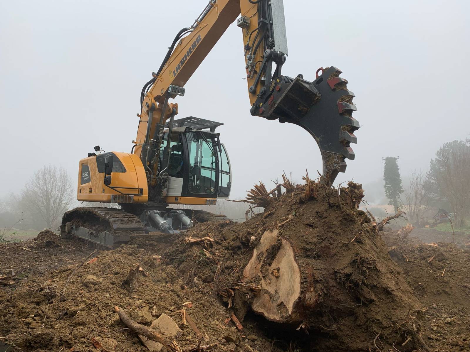 Nous utilisons une pelle mécanique équipée d’un grappin scie, une solution à la fois sûre, rapide et efficace pour gérer de gros volumes d’abattage, de dessouchage et d’évacuation, tout en maîtrisant les coûts.