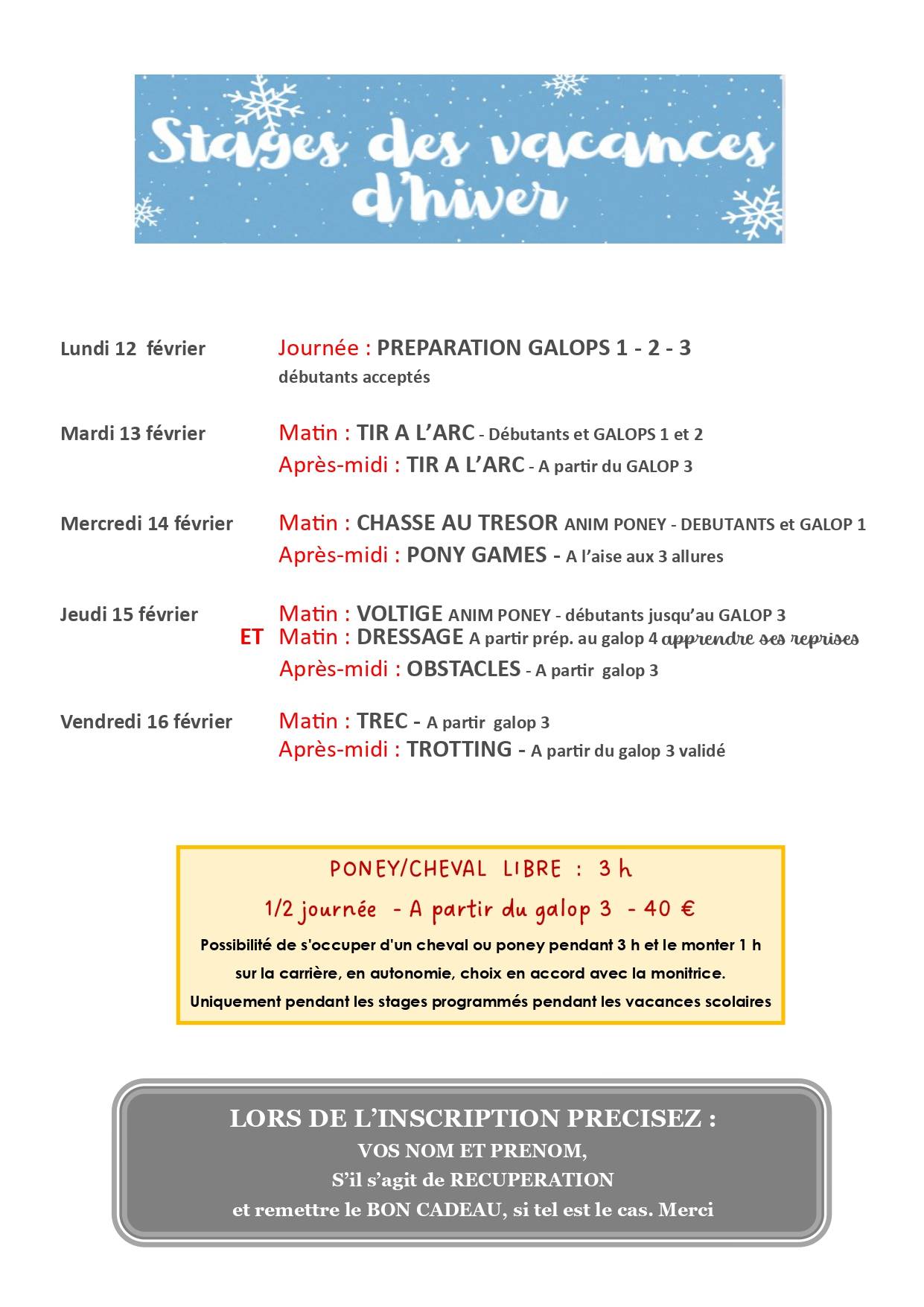 Toujours désireux de donner aux cavaliers la possibilité de varier leurs activités à cheval et de progresser dans cette discipline, le Centre équestre du Haras de Fleyres à Bretx près de Toulouse et Blagnac, vous attend nombreux pendant ces Stages des Vacances d'Hiver !